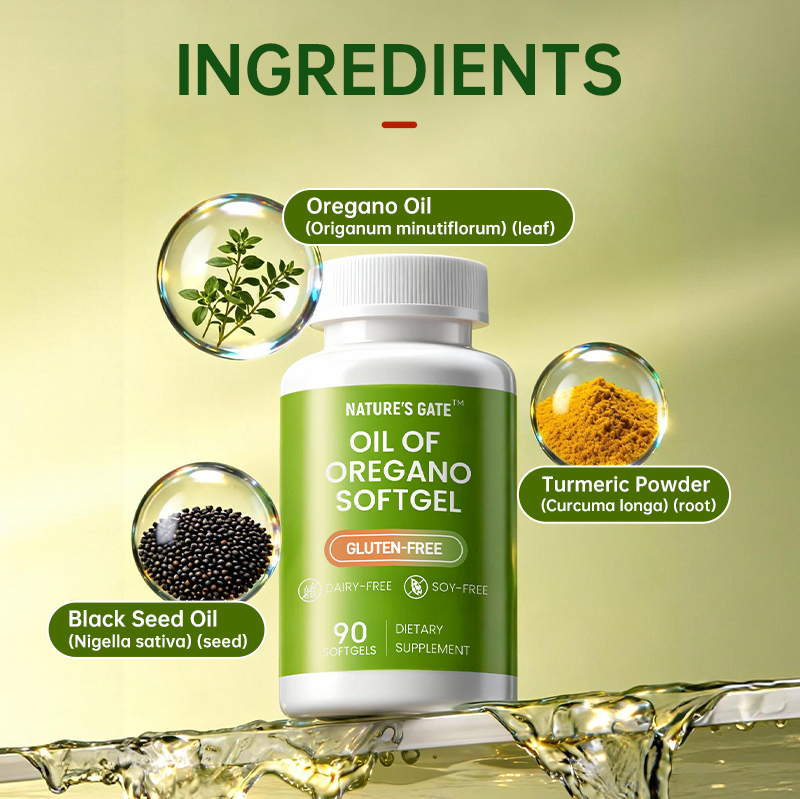 6.1 OIL OF OREGANO SOFTGEL - It is a gluten-free, dairy-free, and soy-free herbal supplement for overall wellness support. This formula combines Oregano Oil, traditionally used for respiratory and immune health, with antioxidant-rich Turmeric Powder and Black Seed Oil for targeted herbal support