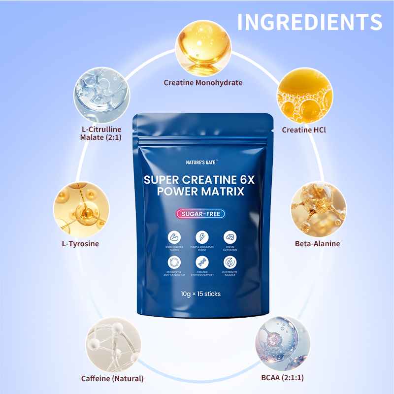 5.1 SUPER CREATINE 6X POWER MATRIX - It is a sugar-free advanced formula designed to maximize workout performance and recovery. It combines a dual Creatine complex (Monohydrate & HCL) for strength and muscle support with L-Citrulline Malate and Beta-Alanine to enhance muscle pump, blood flow, and endurance. Enriched with L-Tyrosine, natural Caffeine for focus, plus BCAAs and electrolytes, this comprehensive matrix creatine powder helps accelerate recovery, support electrolyte balance, and boost overall training intensity.